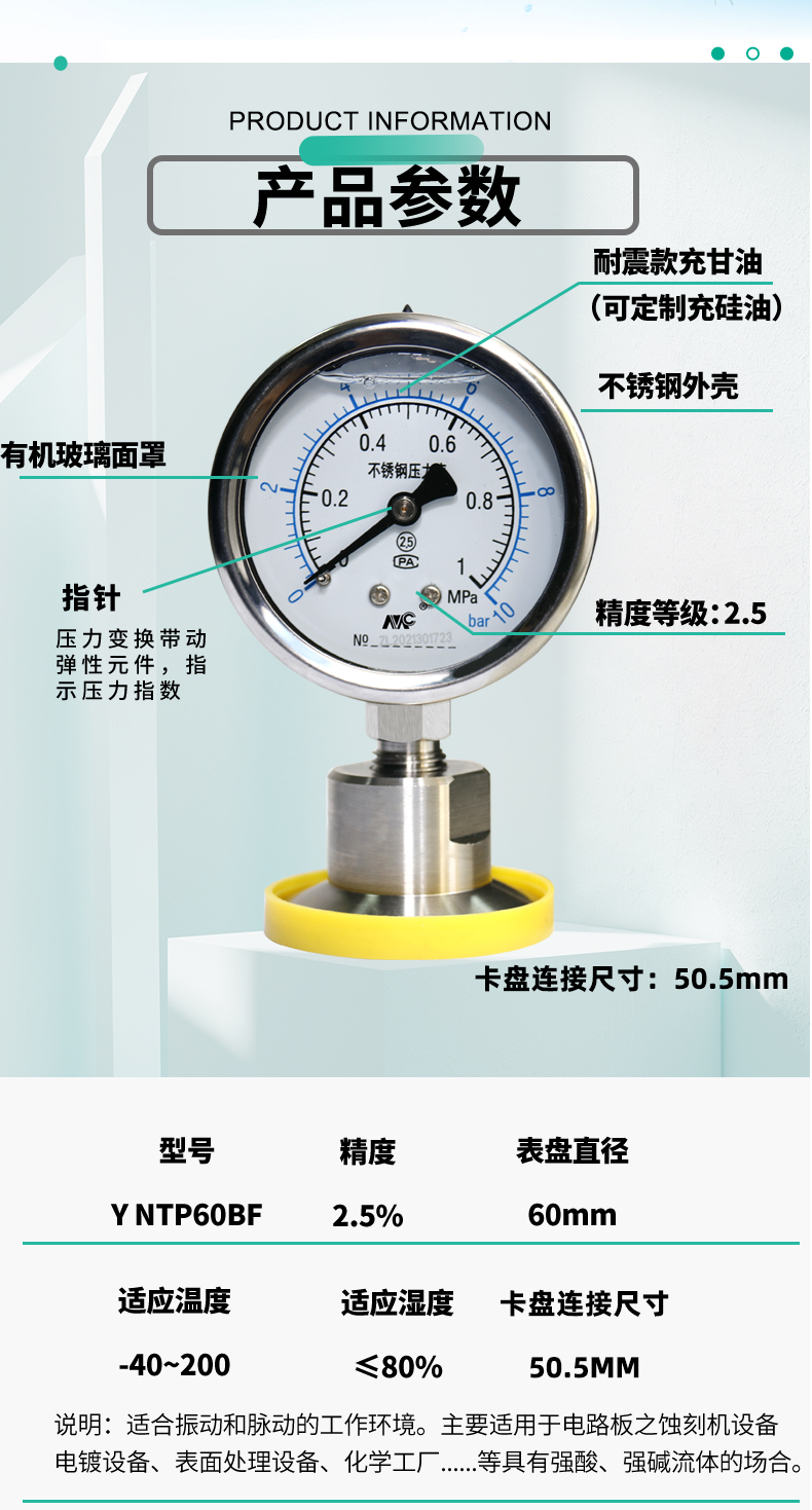 YNTP-60BF不銹鋼衛(wèi)生型隔膜壓力表