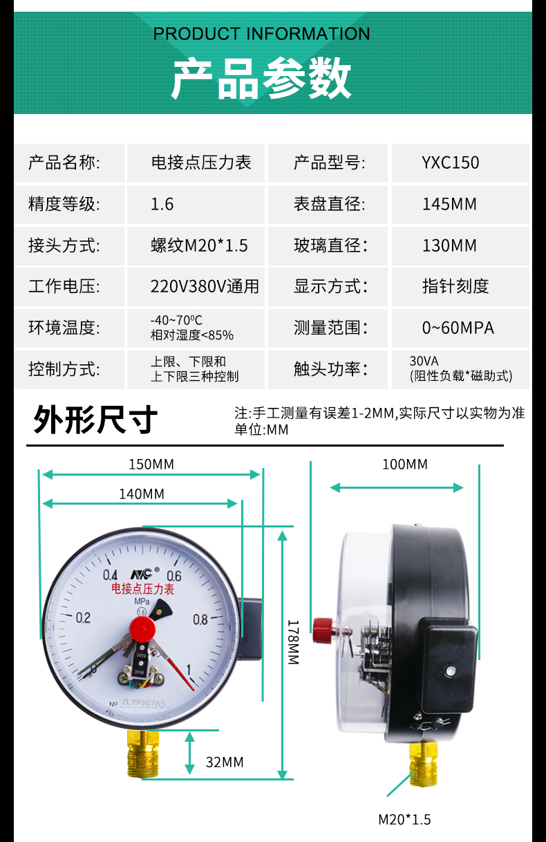 YXC150磁助式電接點(diǎn)壓力表